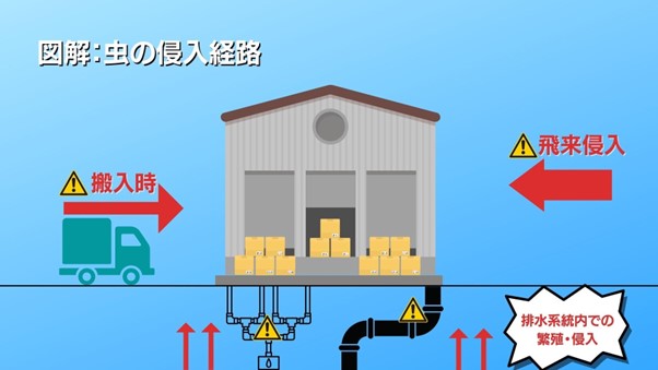 虫がどのように倉庫や工場内へ侵入するのか、パターンを理解し、有効な防虫対策をとりましょう。