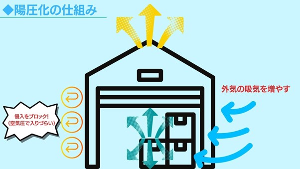 倉庫や工場内の給排気バランスを調査し室内を陽圧化することで、室外からの虫の侵入を防ぎます。