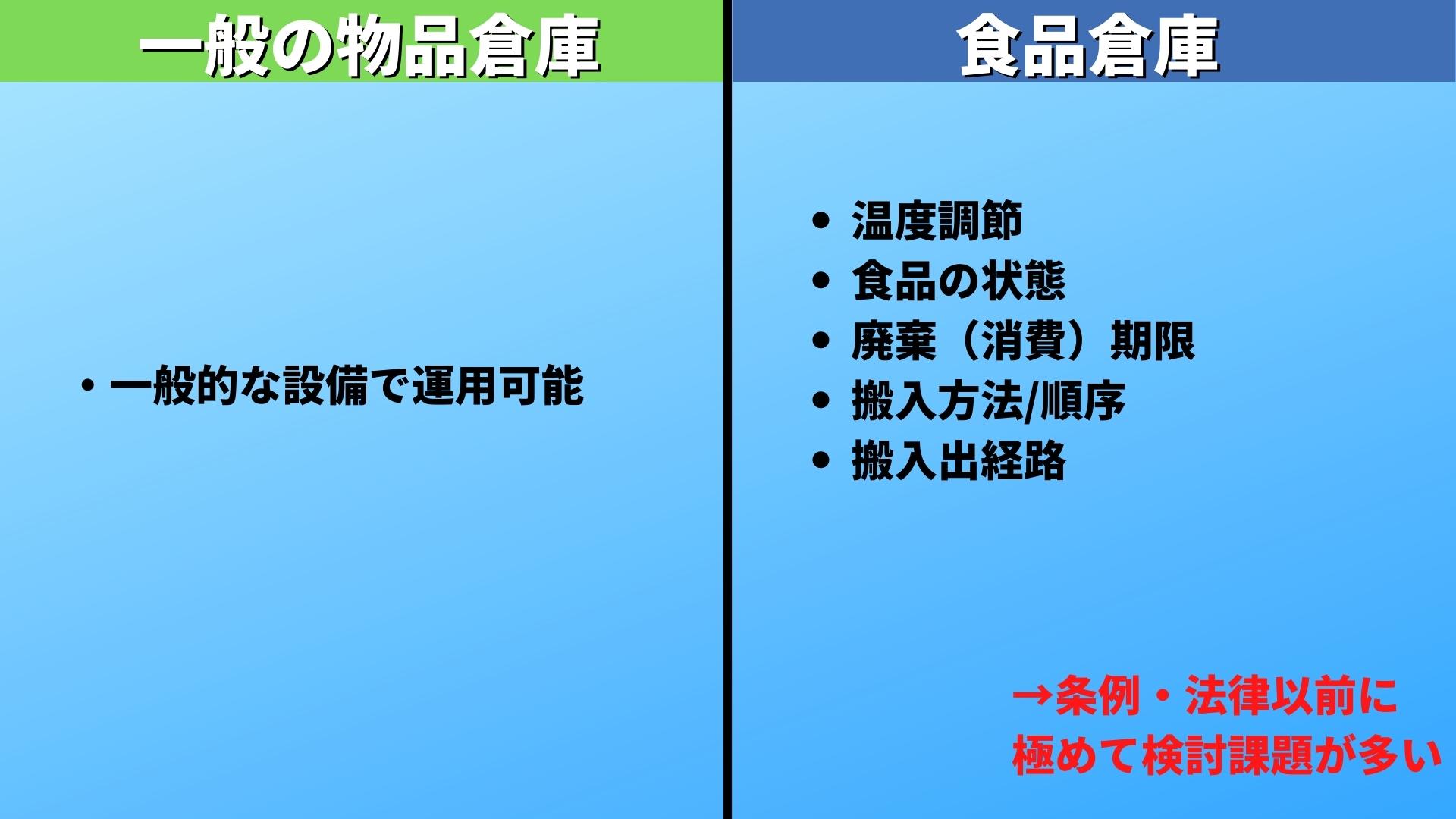 通常の物品倉庫と比較して、扱う商材が「口に入るもの」と考えると、自ずから管理面で様々なルールや基準があることが見えてくるでしょう。
