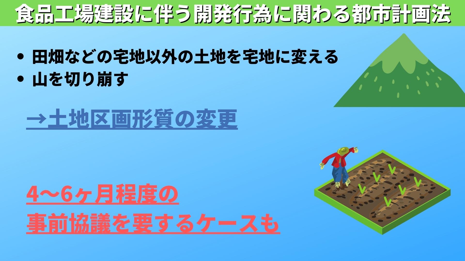 大きな食品工場を作る上で「田畑などの宅地以外の土地を宅地に変える」であるとか「山を切り崩す」といった土地区画形質の変更を行う場合は、4~6ヶ月もの事前協議を行うこともあるため注意が必要です。