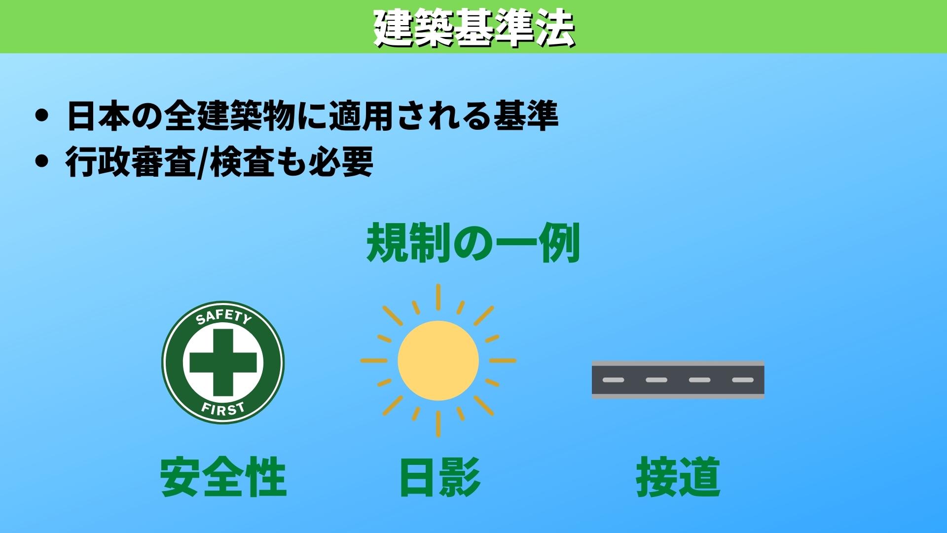 建築基準法は、日本で建築するすべての建物に適用される、建物の安全性や居住性を確保するための技術的基準・規定です。