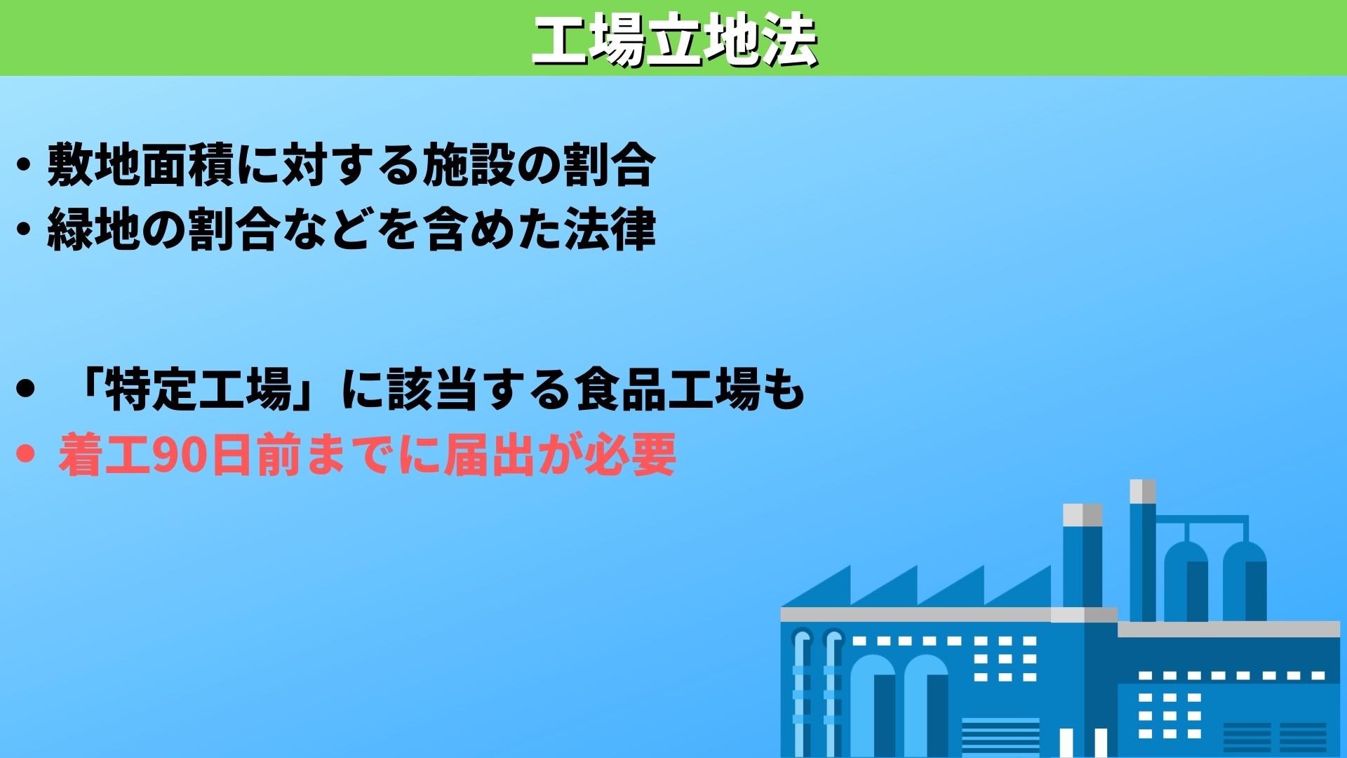 - 食品工場を建設する際、工場の規模や建設する地域によって規制や法律・条例がある