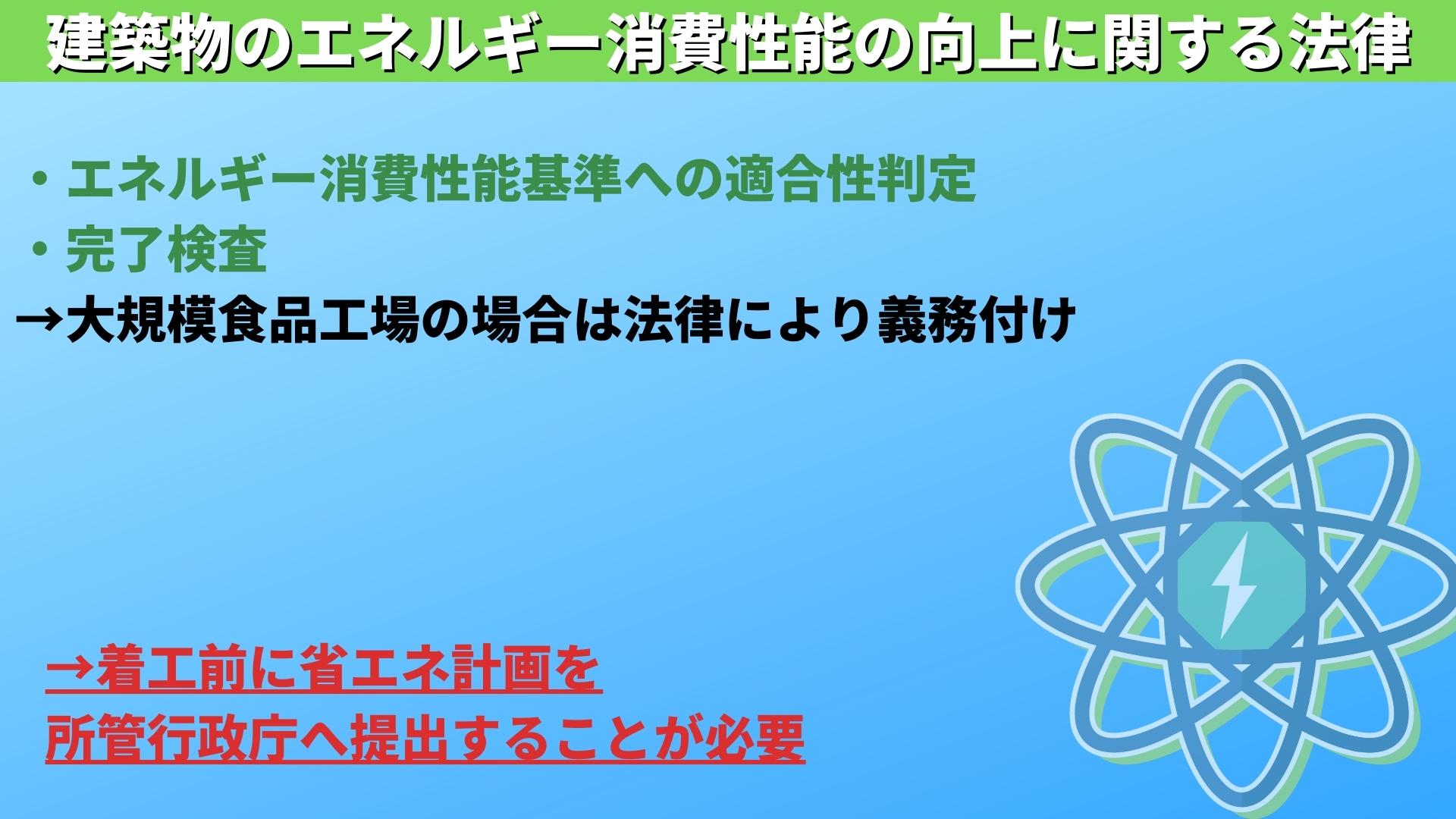 大きな食品工場を作る場合、建築省エネ法が定めるエネルギー消費性能基準への適合性判定や完了検査が義務付けられています。
