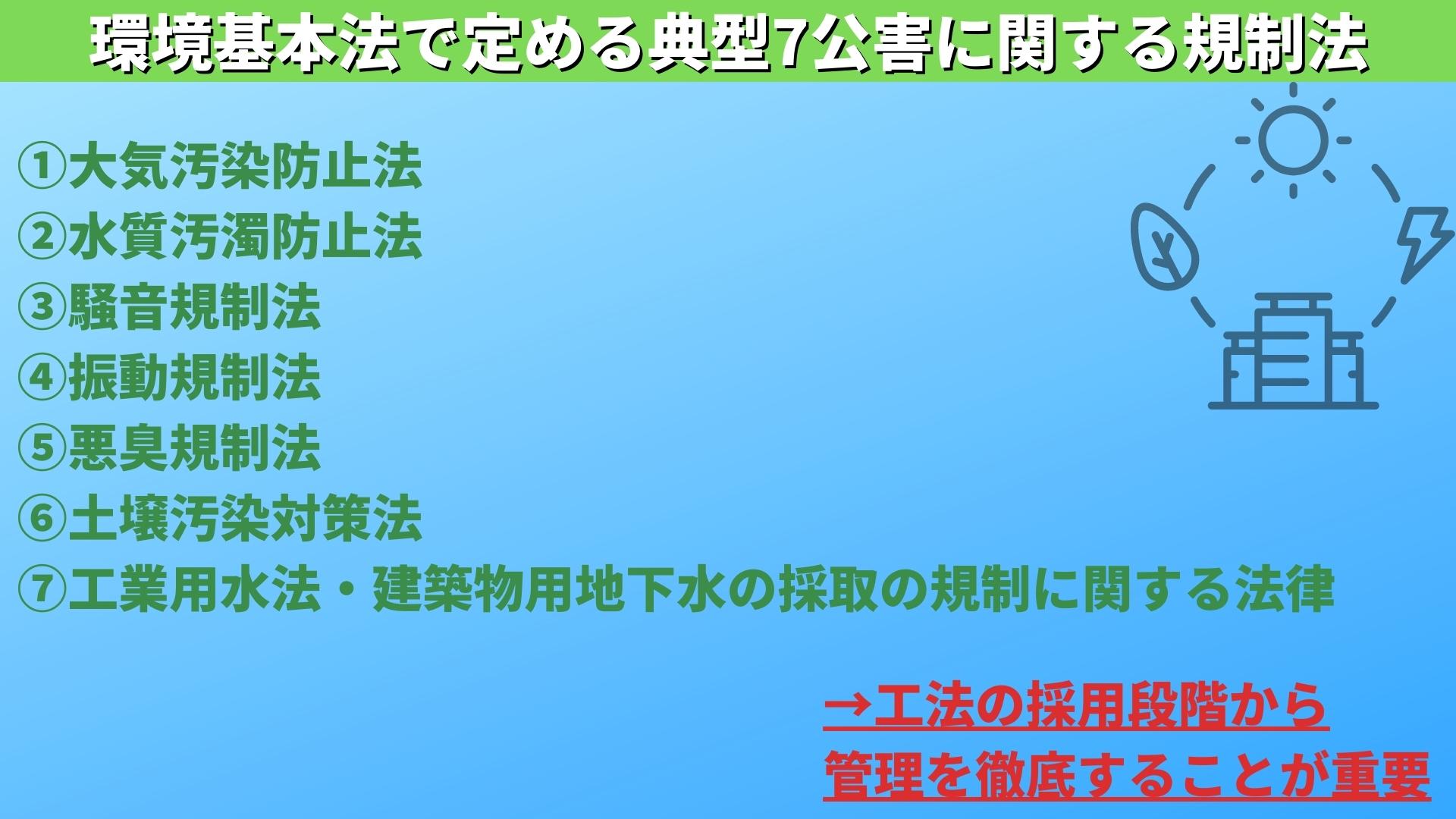 環境基本法で定める典型7公害に関する法律を以下で解説します。