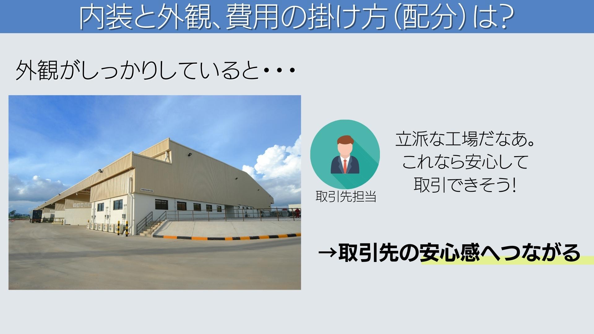 これらは生産性や、事業の実力そのものに大きく関係するためです。つまり、内装など「工場の中」にこだわることは売上にも直結します。