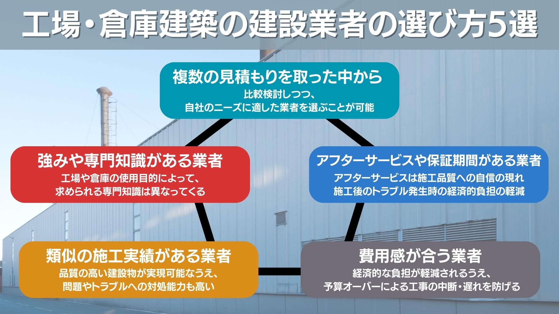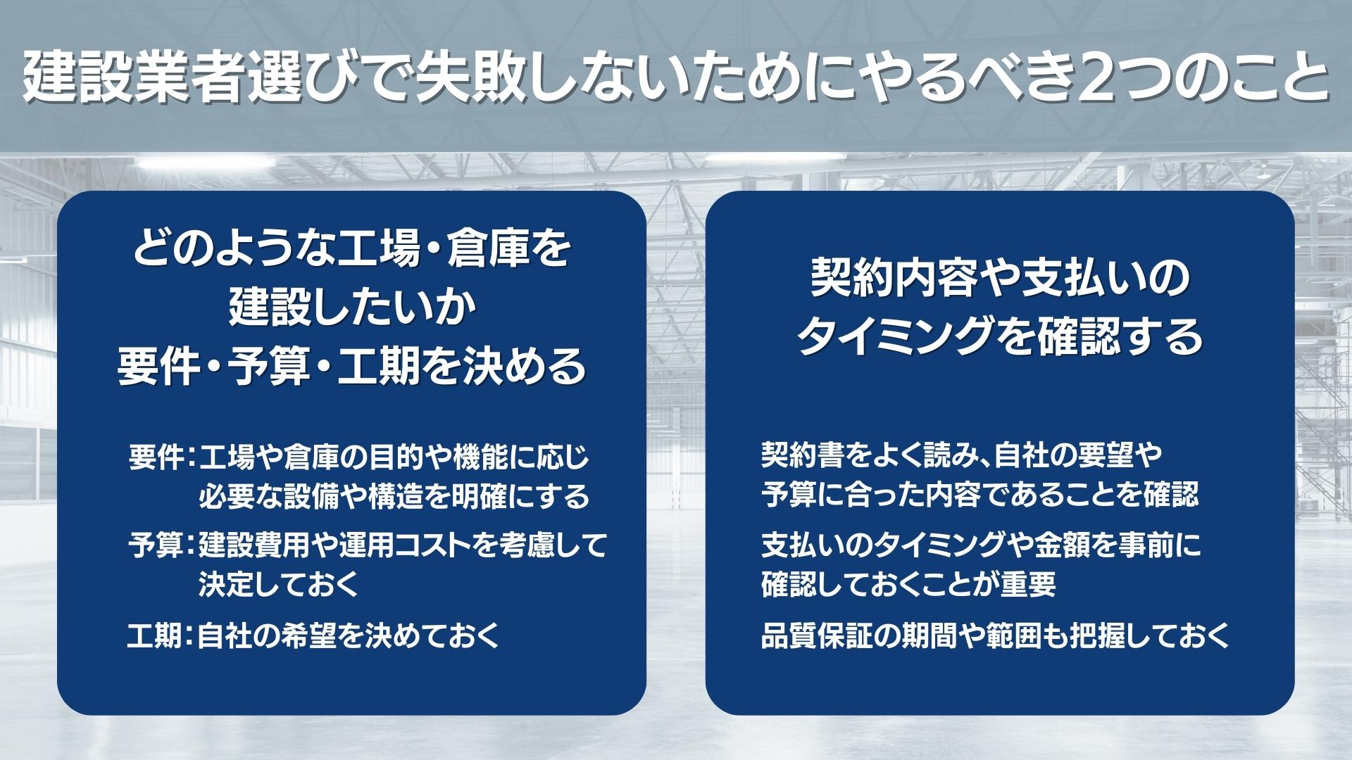 工場・倉庫建築は事業を左右する大きなプロジェクトであり、安心できる業者選定が大変重要になってきます。
