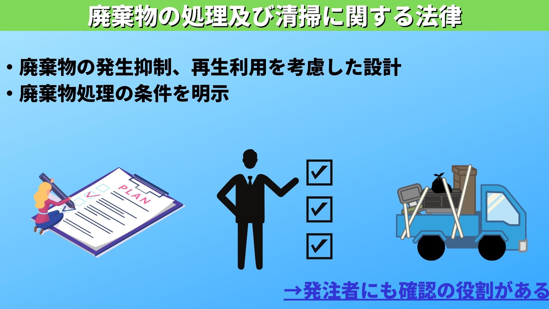 ”発注者は、廃棄物の発生抑制、再生利用を考慮した設計に努めるとともに廃棄物処理の条件を明示する。”