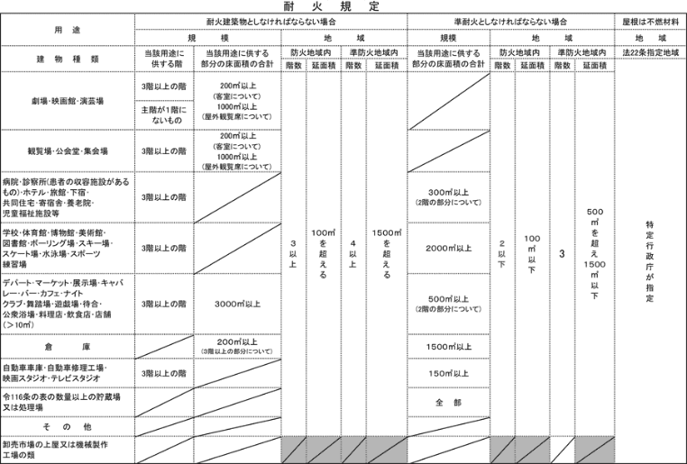 耐火建築物は、火災に対して燃えにくいだけではなく、隣家からの延焼を防止し、火熱のための変形や倒壊しないような構造が求められているのに対して、準耐火建築物は、延焼速度を遅くして市街地の防火に役立てるような構造が求められています。これは、建築物の用途・規模・地域により決められています。以下の表でご確認下さい。クリックすると大きなサイズが別ウインドウで開きます。